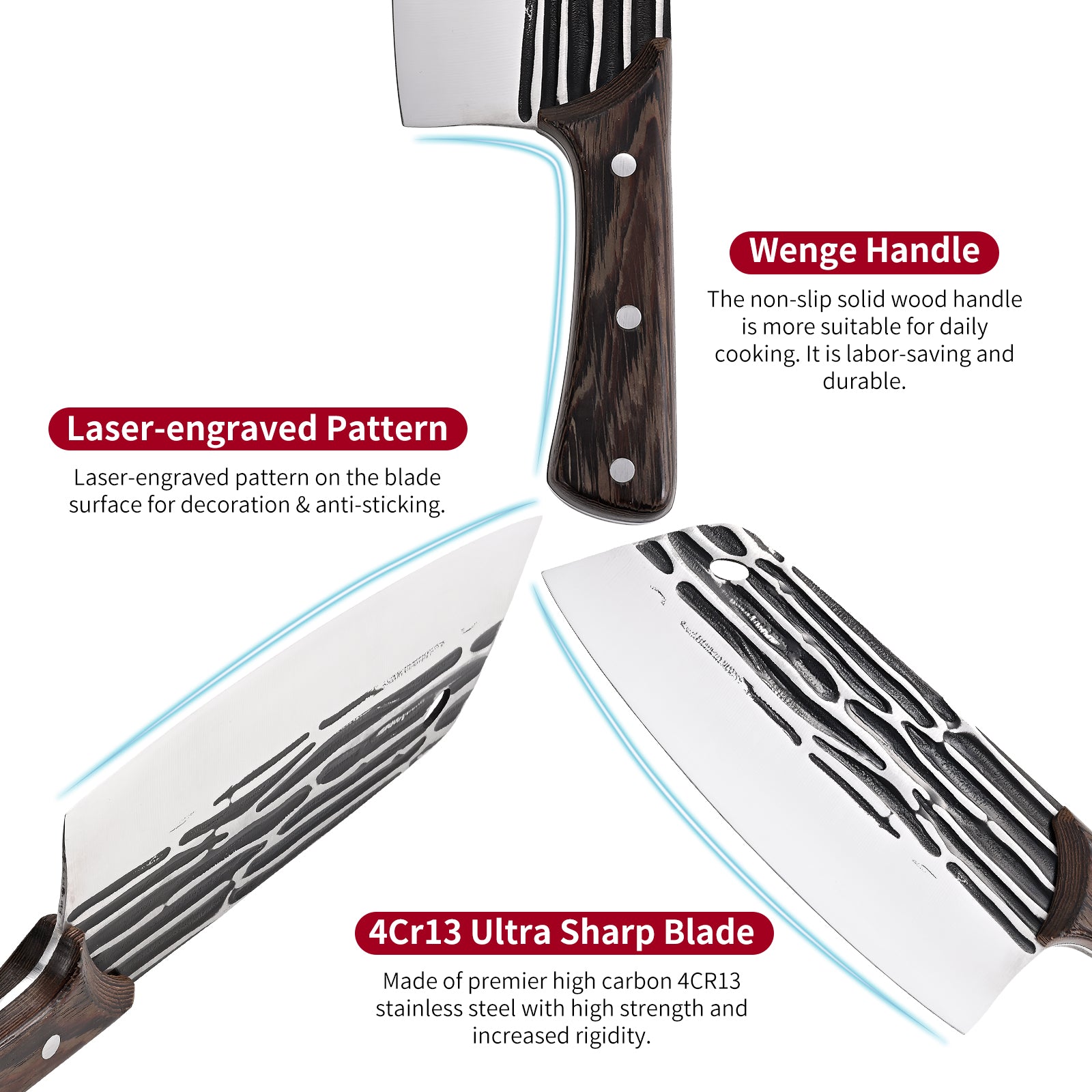 - 【Precise Craftsmanship】These forged chef knives are hand forged by craftsmen with more than 30 years of experience. Our durable knife boasts incredibly sharp blades. The chopping knife can be keeped the blade sharp for a long time, helping you cut food effortlessly. The oxidation blackening and hammering process add an anti-stick effect, enhancing the knife's technical and aesthetic appeal.