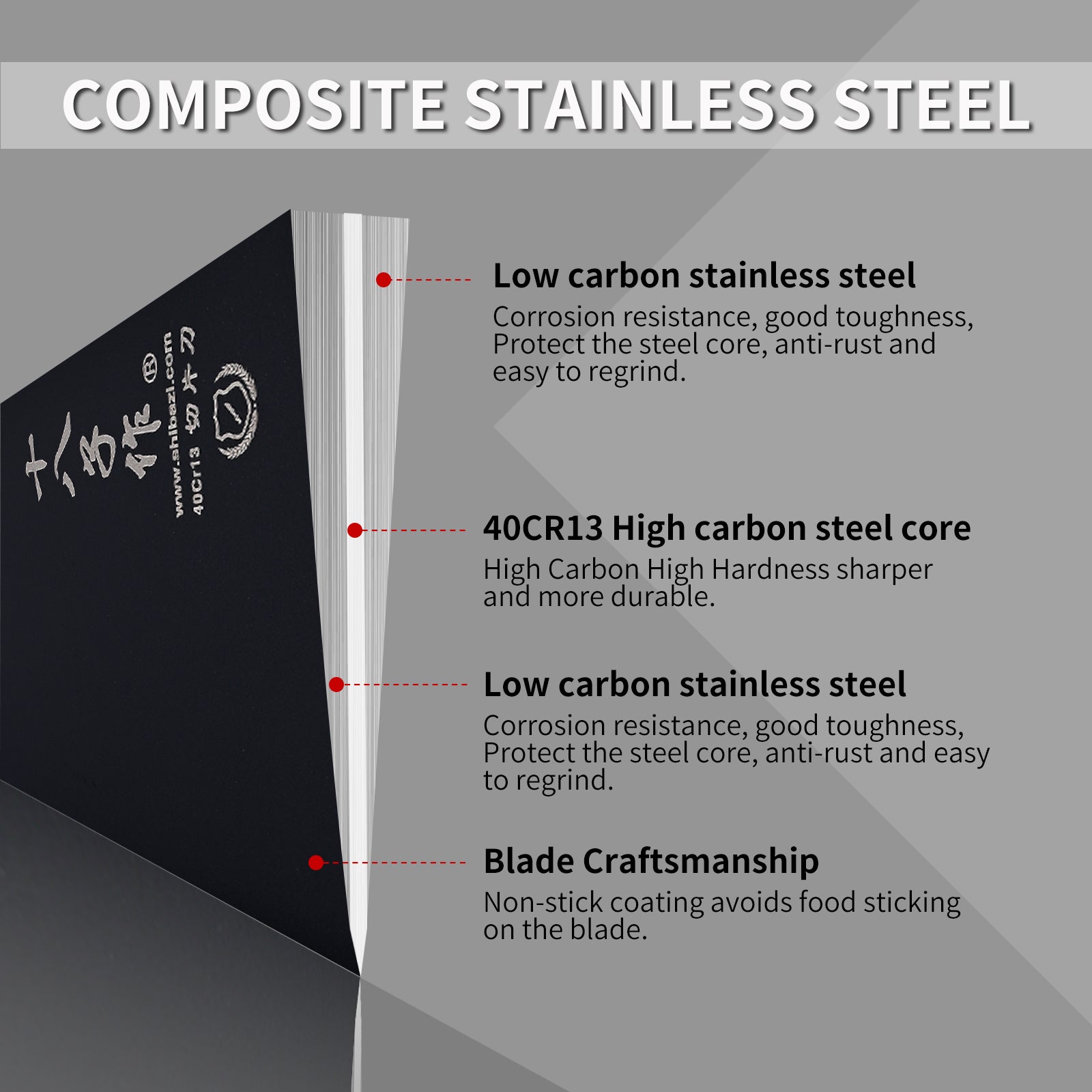- Premium Stainless steel - 3 layer high quality clad 50Cr15 stainless steel of high carbon core steel performs excellent hardness, durability and sharpness maintaining. Outside layers of low carbon steel does well in toughness, corrosion resistance and plasticity. The combination of two steels makes the Cleaver Knife perfectly work.