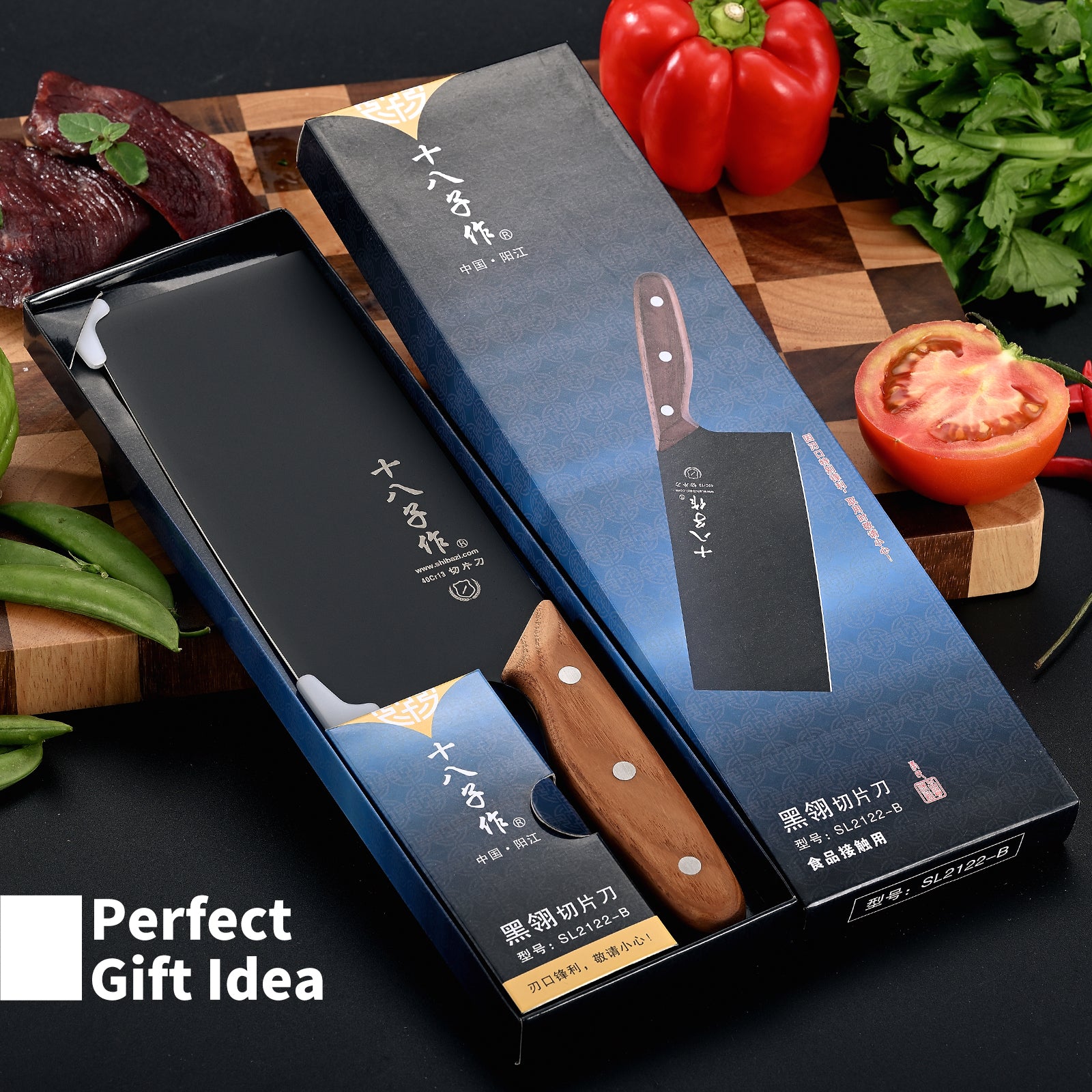 - Blade Craftsmanship - Vacuum heat treatment endows the steel with best mechanical property. Black non-stick coating avoids food sticking on the blade. Full tang blade is more stable and safer.