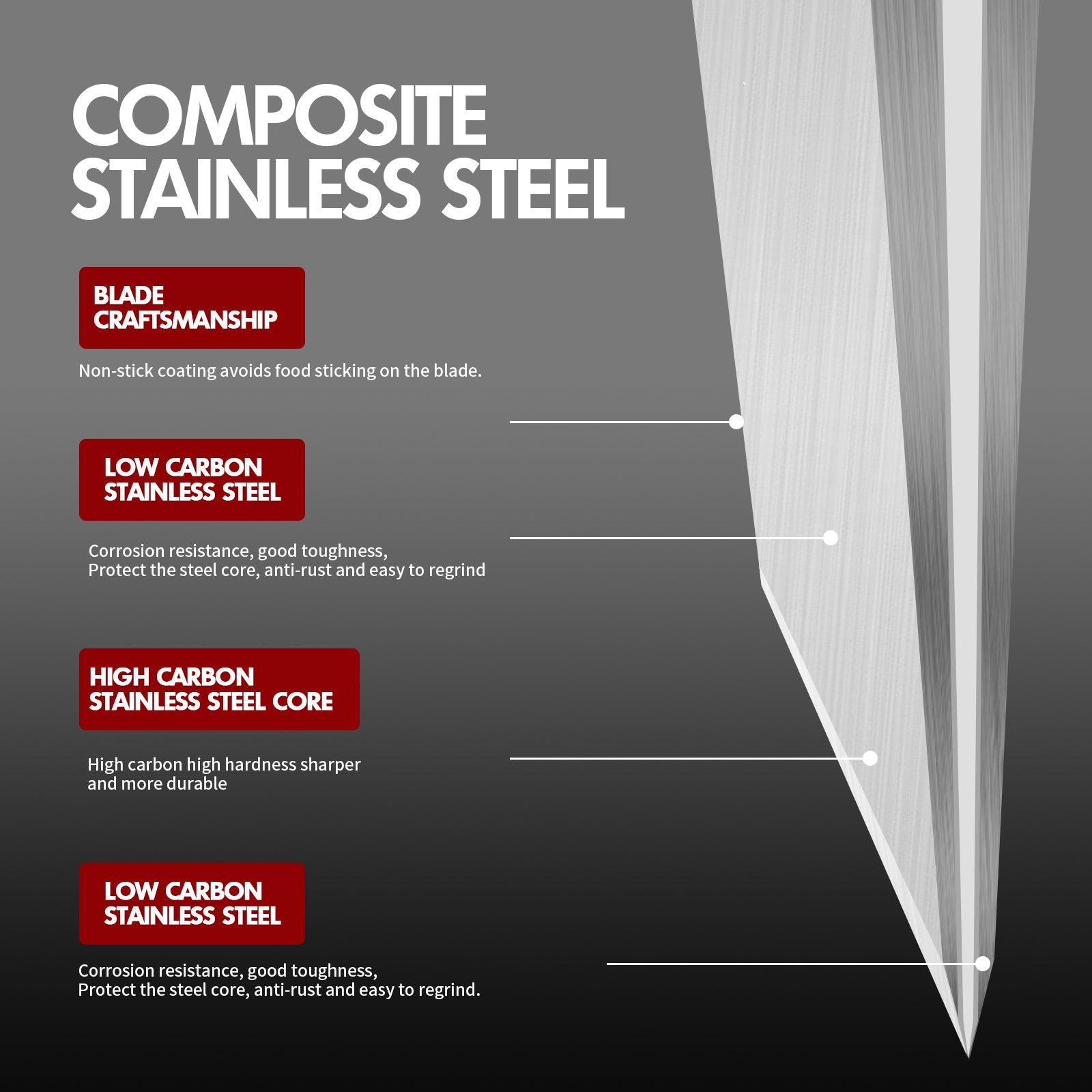 - Premium Stainless steel - 3-layer high quality clad stainless steel. High carbon core steel performs excellent hardness, durability and sharpness maintaining. Outside layers of low carbon steel does well in toughness, corrosion resistance and plasticity. The combination of two steels makes the knife perfectly work.