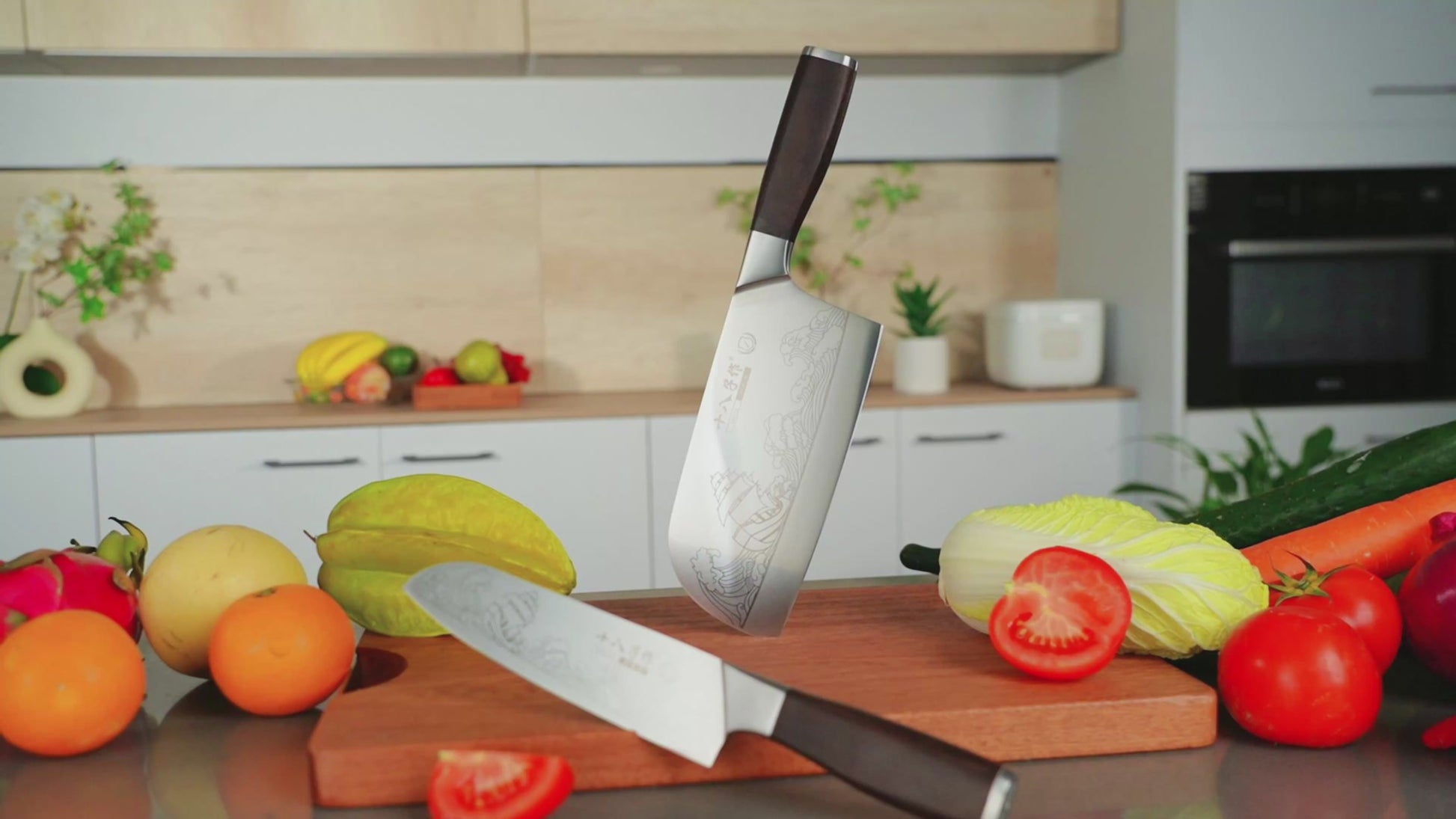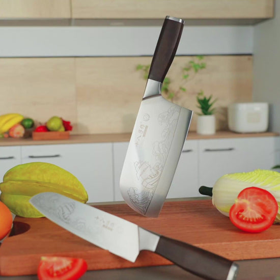 - Professional Knife Set - This kitchen knife set includes 2 razor-sharp knives: a cleaver knife and a santoku knife.Whether you're slicing meat,vegetables,dicing herbs,or prepping fruits, each kitchen knife of this set is designed to handle a variety of tasks effortlessly. Perfect for both professional chefs and home cooking enthusiasts.