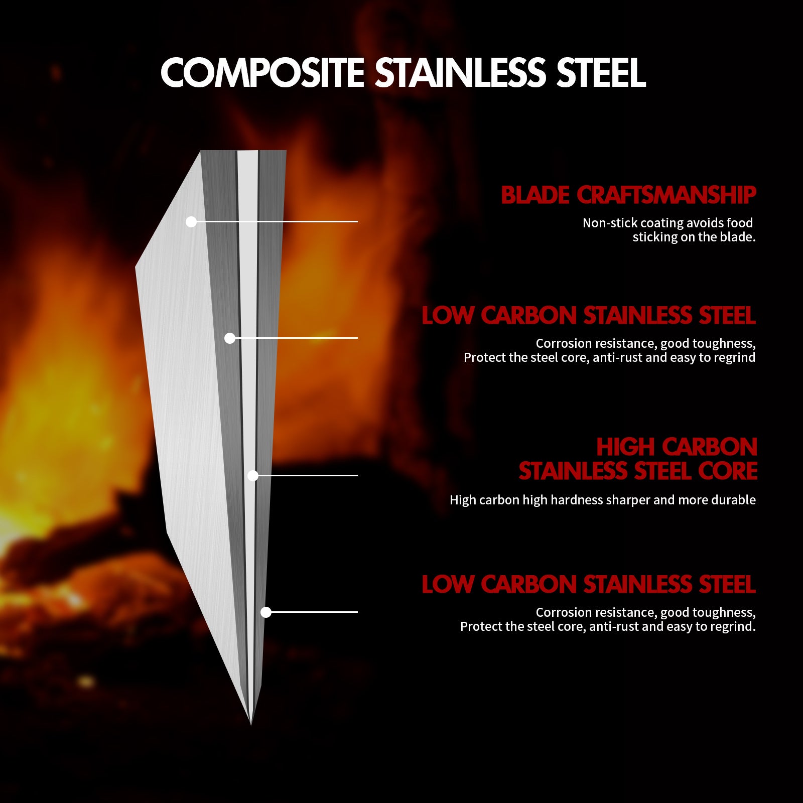 - 【Premium Stainless steel】3 layer high quality clad 30Cr13 stainless steel of high carbon core steel performs excellent hardness, durability and sharpness maintaining. Outside layers of low carbon steel does well in toughness, corrosion resistance and plasticity. The combination of two steels makes this Knife perfectly work.